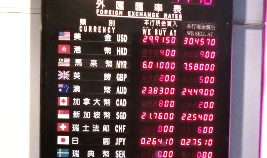 下の写真のようなレートが書いてある窓口で日本円を出して「ハーイ!プリーズ(Hi! Please.)」と言えばOK。この窓口では、円→台湾ドルのレートが、1円=0.26410台湾ドルだった(1台湾ドル=3.8円ぐらい)。