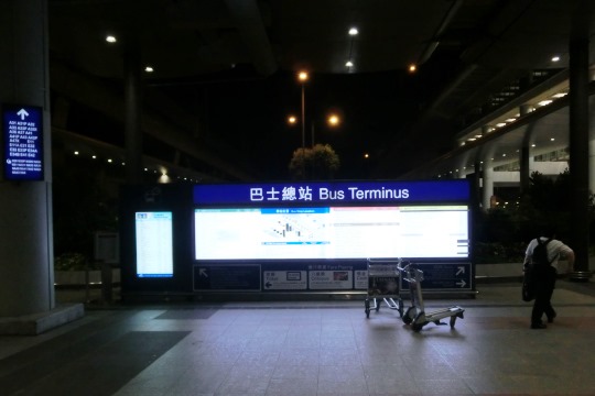 「巴士 Bus」の案内にしたがって進んで、バスターミナルへ到着(写真は香港時刻の夜11時頃)。