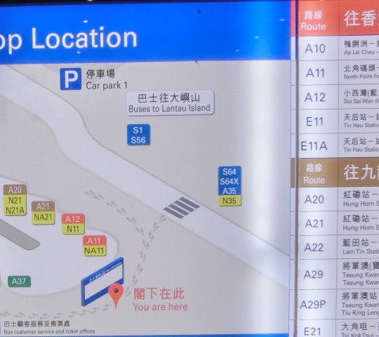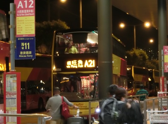 案内板を見ると、各乗場に「1乗場」、「2乗場」、・・・、という番号はなく、バスの系統番号が乗場番号を兼ねている様子。案内板では、香港島方面は赤色、九龍方面は金色、のように色分けされていた。