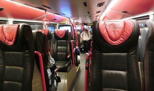 バス車内は座席数も多く、広かったのです。写真は1階の車内で、1つめが座席、2つ目が荷物置き場なのです。写真では小さいスーツケース2つだけですが、大きなスーツケースは下段に置くことができます。