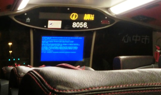 電光掲示板の方は正常に表示されていて、中国語と英語の両方で案内が表示されたのです。発車後に、「市内の最初のバス停まで30分ぐらいかかる」という説明文が表示されたので、30分経過するまでは気を緩めていてもよい(=降りそびれる心配がない)と思い、安心して車内で過ごせたのです。