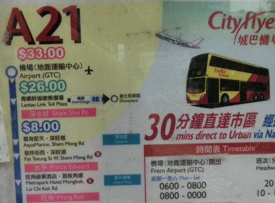 写真は、A21系統(香港空港→九龍方面)の案内なのです。金額は、金額の下にあるバス停から乗車した際の運賃を表しているのです。