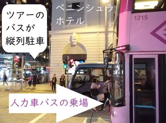 九龍エリアのペニンシュラホテルから人力車バスに乗車する場合は、(夜間に)ホテルの裏に並んでいるツアーのバスとは乗場が異なるので注意。