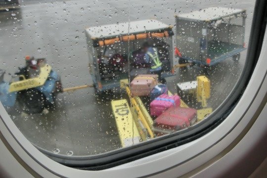 高雄へは10分ほど遅れて到着(誤差の範囲)。窓から外を見ると、係員が預け荷物を運んでいたのです。よく見ると自分のスーツケースが見えた(2枚目の写真の黄色い矢印)!
