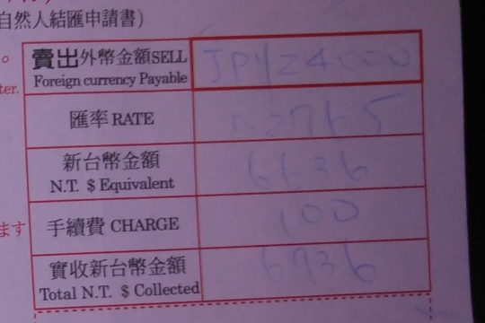 「Japanese Yen Please.(ジャパニーズ円プリーズ)」と言いながら手持ちの約7,000台湾ドルを渡すと、日本円で24,000円になり、端数は台湾ドルでおつりが返された。書類上は「24,000円」という商品を、6,736台湾ドル(24,000×0.2765+手数料100)の代金で購入した形になっている。おつりの一部は出国後に自動販売機でペットボトル飲料を買うのに充てた。