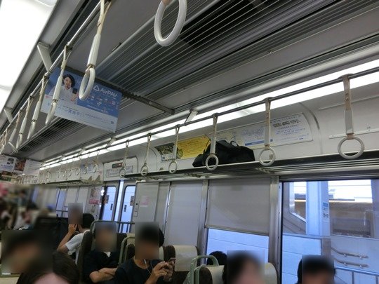 大阪に近づくにつれて乗客が増えていきます。次の写真は大阪駅手前の車内の様子です。通路まで立ち客がいます。